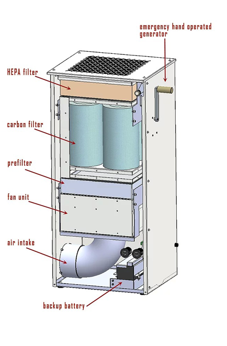 を除去するフィルター換気システムです。核・生物・化学災害(NBC)フィ